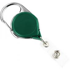 Green Carabiner style reel with chrome outer frame. Features a pressure release latch that easily attaches to belt loop or purse strap. The twist free feature keeps ID facing forward with vinyl strap fitting.