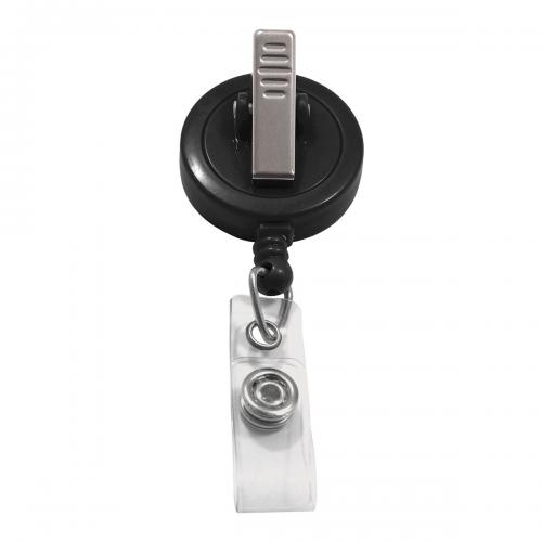 Attaches at any angle and keeps your ID hanging straight. Black plastic solid reel with swivel clip and clear vinyl strap. Reels can be customized with your company name or logo, for additional fee, call for your specialized quote.
