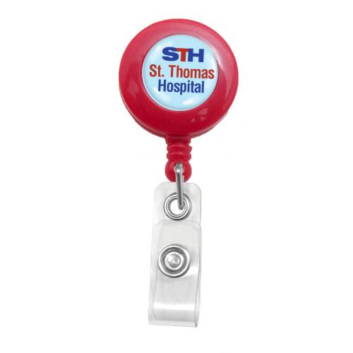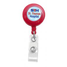 Attaches at any angle and keeps your ID hanging straight. Red plastic solid reel with swivel clip and clear vinyl strap. Reels can be customized with your company name or logo, for additional fee, call for your specialized quote.