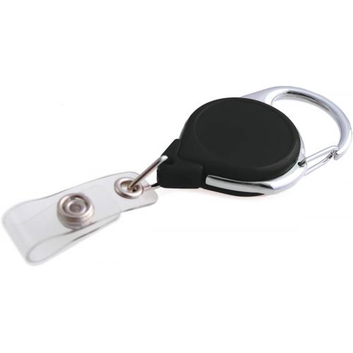 Black Carabiner style reel with chrome outer frame. Features a pressure release latch that easily attaches to belt loop or purse strap.