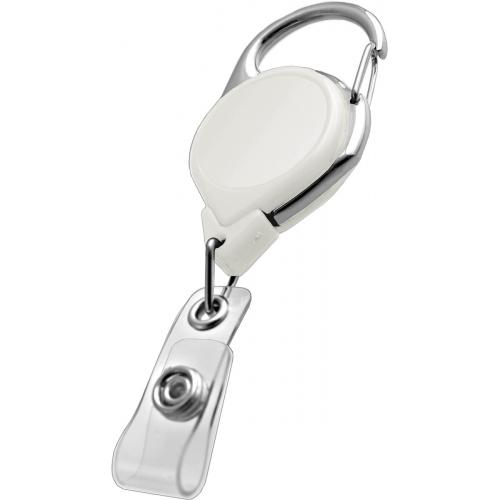 White Carabiner style reel with chrome outer frame. Features a pressure release latch that easily attaches to belt loop or purse strap. The twist free feature keeps ID facing forward with vinyl strap fitting.