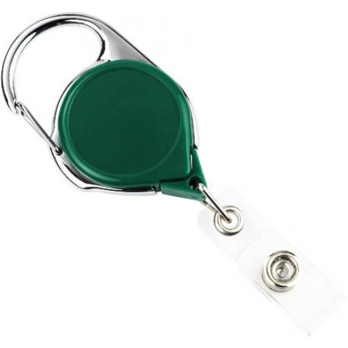 Green Carabiner style reel with chrome outer frame. Features a pressure release latch that easily attaches to belt loop or purse strap. The twist free feature keeps ID facing forward with vinyl strap fitting.