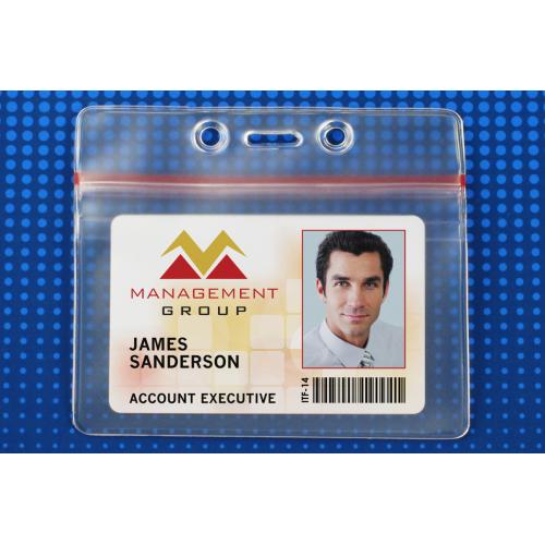 Keep out dirt and moisture with our clear government size horizontal soft vinyl badge holder with red resealable closure and slot/chain holes.